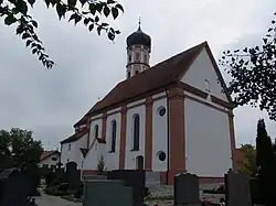 Die Kirche gehörte früher zum Kloster Steingaden. Ritter Johann von Löwenthal stiftete 1245 einen Jahrtag. Das untere Teil des Turmes stammt noch aus dem 15. Jahrhundert. Nachdem die alte Kirche 1694 baufällig geworden war, ließ angeblich Herzog Maximilian Philipp von Bayern von seinem Baumeister Echter Pläne für einen Neubau anfertigen. Das Turmoktogon erbauten die Baumeister Thomas Natterer und Georg Miller aus Mindelheim. Der Neubau des Langhauses und des Chors wurde 1701 ausgeführt, nachdem 1700 ein Konsens zum Neubau erzielt worden war. Der Bau enthält typische Stilelemente von Thomas Natterer, der in der Umgebung mehrere Kirchen baute. Am 28. April 1701 war die Grundsteinlegung, belegt durch einen Inschriftenstein neben dem Eingang. Die Weihe der Kirche durch den Weihbischof Johannes Eustache Egolf von Westernach fand am 19. Januar 1704 statt. Von ihm befindet sich an der Westwand des Chores ein Gemälde. Der Innenausbau zog sich noch über mehrere Jahre hin. Die Gemälde an der Empore stammen aus dem Jahre 1717, das Kirchengestühl wurde 1719 angefertigt. Der Apostelzyklus wurde 1721 gekauft. Die Kanzel sowie die Seitenaltäre sind aus dem dritten Viertel des 18. Jahrhunderts. Im späten 18. Jahrhundert wurde eine neue Decke eingezogen, das Fresko ist mit 1793 datiert. Der Hochaltar wurde 1825 angeschafft. Renovierungen fanden 1870, 1922 bis 1923 statt, außen wurde die Kirche 1952 und 2016 renoviert.
