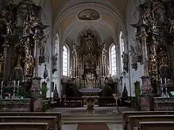 Der Chor ist eingezogen und besitzt zwei Joche mit Kreuzgratgewölbe und einen halbrunden Schluss mit einer Dreikappenwölbung. Der Chorboden ist gegenüber dem Langhaus um zwei Stufen, das Ostjoch um weitere zwei Stufen erhöht. Der Chorbogen ist rundbogig. Das Langhaus mit vier Achsen besitzt eine Flachdecke über hohen Vouten an den Längsseiten. Die Wandgliederung wird durch toskanische Pilaster mit dreiteiligen Gebälkstücken erreicht. Diese sind im Langhaus gestaffelt, im Chorschlussansatz kurz unterhalb der Kapitelle abgeschnitten. Die Chorbogenlaibung hat im Osten einen gestaffelten, in den Langhausecken halbe gestaffelte Pilaster. Die Fenster sind eingezogen und rundbogig. Im Chorscheitel und im Chorwestjoch befindet sich kein Fenster, dafür sind dort stichbogige Türen zum Turm und zur Sakristei, die 1793 neu gestaltet wurden. Das Türblatt trägt oben einen gemalten Lorbeerkranz und eine Girlande mit Feldern. Der Türstock ist mit Schnitzdekor aus Flechtband, Eck- und Scheitelsteinen und mit Rosetten geschmückt. Über der Sakristeitüre befindet sich ein breit korbbogiges Oratoriumsfenster. Es ist durch ein durchbrochenes, aus Holz geschnitztes Brüstungsgitter mit einem Jesus- und Marienmonogramm aus dem Anfang des 18. Jahrhunderts geschlossen. In der dritten Achse des Langhauses befinden sich beiderseits Stichbogentüren. Die südliche ist eine Kopie der alten Tür und mit 1719 bezeichnet. Sie besitzt ein geohrtes Feld unter einem Schweifgiebel sowie die alten Beschläge.