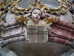 Die obere Brüstung beginnt ganz links mit der Darstellung, wie der Erzengel den Erdenbürgern zur Hilfe eilt. Die Inschrift lautet Der H. Ertzt Engel Michael kombt dem Volkh gottes zu hilff. S. A. A. M. Fr. ANNO 1717. Das zweite Bild zeigt Jesus in der Einöde mit der Inschrift Die Engel Tratten her zu Und dienetten Ihm. K. d. B. A. P. L. ANNO 1717. Jesus auf dem Ölberg zeigt das nächste Bild. Es trägt die Inschrift E´Ershiene Ihm aber Ein Engel Vom himel Vnd störkhet Ihn. P. M. V. M. I. K. Anno 1717. Das vierte Bild von links zeigt Maria in der Glorie. Sie ist von Engeln umgeben und es trägt die Inschrift Die heiligiste gebährerin gottes ist erhöchett über alle Chöre der Engelm. J. V. H. et H. H. U. or ANNO 1717. Das letzte zeigt eine Szene, in der ein Engel Daniel in der Löwengrube befreit. Die Inschrift auf diesem Bild lautet Michael Einer Von den Vornehbsten firsten kam mir zu hilf. Daniel Egger von hier. ANNO 1717.