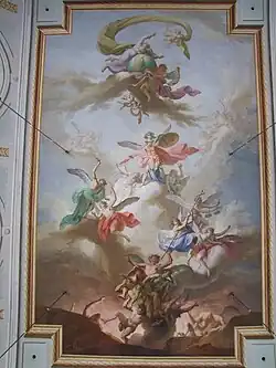 Die Fresken der Kirche stammen von Johann Joseph Anton Huber aus Augsburg aus dem Jahre 1793. Im Chor-Ostjoch befinden sich in einem Kreisfeld drei Putten auf einer Wolkenlandschaft mit den Attributen von Glaube, Hoffnung und Liebe. Im Langhaus nimmt das Deckenfresko fast die gesamte Decke ein und ist stilistisch bereits dem frühen Klassizismus zuzuordnen. Die zentrale Figur des Erzengels Michael trägt eine Rüstung. Der mit bunten Federn geschmückte Helm hat kein Visier. In der Rechten hält Michael ein Flammenschwert, die erhobene Linke hält ein Schild mit der Inschrift QVIS VT DEVS. Über dem Erzengel ist auf einer Wolke Gottvater zu sehen, der auf einer Kugel liegt. Unter dem Erzengel Michael sind kämpfende Engel dargestellt, von denen zwei seine Attribute, die Waage und einen langen Kreuzstab tragen. Den unteren Rand des Freskos, das mit den ligierten Initialen JHuber 1793 bezeichnet ist, bilden die gefallenen Engel. Um beide Fresken sind goldgelbe Profilrahmen angebracht. Weitere Fresken der Kirche gruppieren sich auf die restlichen Deckenflächen in Chor und Langhaus. Sie sind schlichte klassizistische Dekorationsmalerei in Grün und Ockergelb. Im Chor befindet sich in den Querkappen sowie an den Gurten der Chorlaibung gelbe Brokatmalerei, die Längs- und Chorschlusskappen sind grün getönt.