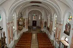 Das Langhaus legt sich in abgerundeten Ecken an den Chor. Das Tonnengewölbe der Kirche mit Stichkappen und doppelten Quergurten liegt auf Doppelpilastern.[4] Der Turm von St. Michael steht nördlich des Chors, ist unten viereckig, oben achteckig und mit einer Kuppel versehen. Die Turmhöhe beträgt 38 Meter.