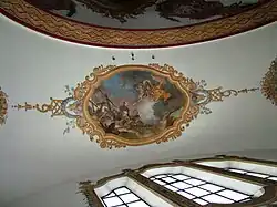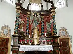 Von der Lichtführung und der baulichen Konzeption her ist die Kirche auf den Hochaltar zugeschnitten. Er zeigt den überdimensional großen Kirchenpatron Sankt Michael, der sich inmitten von vier schlangenartig gewundenen und blau marmorierten Säulen von den zwei ihn symmetrisch umgebenden Erzengeln absetzt. Michaels Kampf gegen das Böse ist auch Thema in den Deckenmalereien Waldemar Kolmsbergers, welche die Fragen nach der Vollendung und den Grenzen menschlichen Handelns thematisieren. Das Deckengemälde über der Vierung zeigt etwa die in der katholischen Kirche dogmatisierte leibliche Aufnahme Mariens in den Himmel; ein kleineres über der Orgelempore zeigt den Erzengel Michael mit der Frage „Quis ut deus“ – „Wer ist wie Gott?“. Eine charakteristische Besonderheit sind neben dem am Ende des Hauptschiffs hängenden Kronleuchter auch die beiden Deckengemälde am Ende des nördlichen und südlichen Querschiffes. Das Südliche zeigt inmitten eines tristen Schlachtfeldes einen aufschauenden Soldaten, der im in den Armen von Joseph sitzenden Jesuskind einen Lichtblick in seinem Leben sieht. Das Nördliche zeigt Soldaten, die vor dem Krieg hoffnungsvoll auf einem Schiff zu Maria und dem Jesuskind beten. Beide Gemälde zusammen zeigen den gerade für Bauern im Zyklus der Jahreszeiten so alltagsprägenden Wechsel von sonnigem Sommer und verderblichem Winter, warnen zugleich aber auch vor den Folgen von Krieg und Selbstüberschätzung.