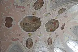 - Die Sandsteinkartusche von 1720 mit dem Relief des Erzengels Michael an der südlichen Langhauswand stammt aus der Kirche des ehemaligen Benediktinerklosters Fultenbach.