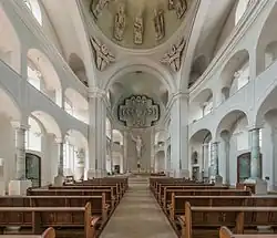 Das Deckengewölbe des Langhauses trägt drei ovale Bildmedaillons von 4,2 × 5,2 m Größe. Sie zeigen von hinten nach vorn