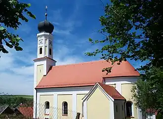 Die Saalkirche wurde 1722 erbaut. Sie besteht aus einem Langhaus, einem eingezogenen, halbrund geschlossenen Chor im Osten, an dessen Südwand im 18./19. Jahrhundert die Sakristei angebaut wurde, und einem Fassadenturm auf quadratischem Grundriss im Westen, dessen oberstes, achteckiges Geschoss die Turmuhr und den Glockenstuhl beherbergt, auf dem eine Zwiebelhaube sitzt.