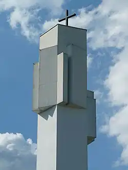 In der Nähe des Spitals Zollikerberg und der Station Zollikerberg der Forchbahn gelegen, befindet sich die Kirche St. Michael auf abfallendem Gelände an der Ecke Neuweg und Wilhofstrasse. Der 32 Meter hohe, fünfeckige Betonturm zeigt dank seiner Höhe von weitem, wo sich die Kirche befindet. Sein Glockenstuhl wurde mit kubischen Formen derart gestaltet, sodass er aus einigen Blickwinkeln an eine Hand erinnert. Bekrönt wird der Turm durch ein 2,90 Meter hohes und 1,50 Meter breites Kreuz.[10] Im Kirchturm befinden sich fünf Bronzeglocken, die auf das Geläut der reformierten Kirche Zollikerberg abgestimmt sind. Sie wurden von der Glockengiesserei Rüetschi, Aarau hergestellt, an Christi Himmelfahrt geweiht und am 19. und 20. Mai 1966 durch die Schuljugend in den Turm aufgezogen.[11] Die fünf Glocken besitzen folgende Daten[12] und Inschriften:[13]
