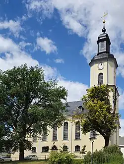 Die heutige, nüchtern klassizistische Saalkirche geht vermutlich auf eine Gründung durch Dietrich von Naumburg-Zeitz im 13. Jahrhundert zurück. Das Bauwerk wurde nach mehreren Bränden wiedererrichtet, zuletzt in den Jahren 1824/25. Restaurierungen wurden in den Jahren 1860 und 1913 durchgeführt.