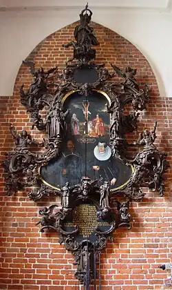 Über der Kreuzigungsszene ist eine Figur der Caritas zu sehen, links davon Moses mit den Gesetzestafeln und rechts Johannes der Täufer, ferner die Evangelisten Lukas und Johannes. Ein Abendmahlsengel mit Brot und Weinkelch schließt die Komposition nach oben ab.