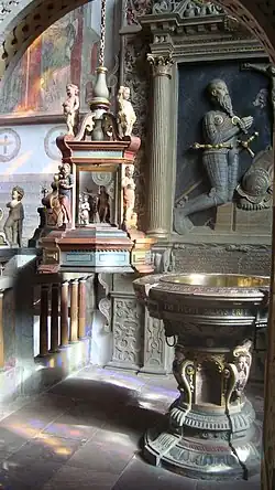 Hinter der Taufanlage befindet sich das Epitaph für den Ritter Franz von Kerssenbrock († 1576). Das Werk des Lemgoer Architekten und Bildhauers Hermann Wulff aus dem Jahr 1578 zeigt den Verstorbenen in voller Rüstung vor dem Kruzifix, umrahmt von einem Säulengehäuse mit Wappen. Im aufgesetzten Teil erscheint die Halbfigur des segnenden Gottvaters, umgeben von Fides, Spes und Caritas (Glaube, Hoffnung und Liebe).
