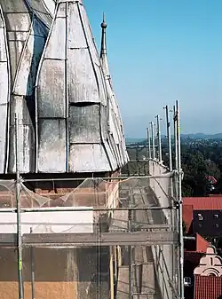 Die Spitze des Nordturms wurde abgenommen und die Glocke herausgeholt, die nun nach einer Reparatur als dritte Glocke das Geläut im Südturm vervollständigt (siehe 7.).