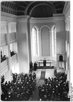 Der Wiederaufbau begann 1946 und war im Wesentlichen bis 1954 abgeschlossen. Das mittlere Fenster der Apsis wurde in diesem Zusammenhang zugemauert. Für diese Fläche schuf der Maler Günter Johl das Wandbild „Durchbrecher aller Bande“.