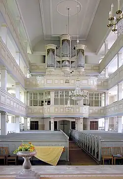Das Hauptstück der Ausstattung ist ein monumentaler Kanzelaltar mit vier hohen korinthischen Säulen. Die Mensa ist aus Porphyr gebildet und wird durch kannelierte Lisenen gegliedert. Die ebenfalls aus Porphyr bestehende Taufe steht auf einer gebauchten Säule, der vergoldete Deckel ist mit einer Darstellung des segnenden Christus verziert. Die heutige Orgel ist ein hauptsächlich in den Jahren 1891 und 1952 überarbeitetes Werk von Urban Kreutzbach aus dem Jahr 1843 mit heute 34 Registern auf zwei Manualen und Pedal.[1]