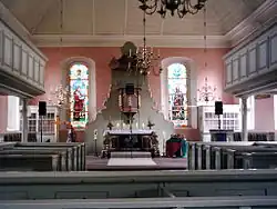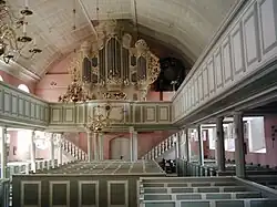 Betritt man das Innere der Kirche, so fallen einem sofort die rosa getünchten Wände und die weißen Emporen auf, die den Raum an der nördlichen, südlichen und westlichen Seite umschließen. Nach oben auf die Emporen gelangt man zum einen über zwei Treppen im westlichen Teil der Kirche, vor dem Übergang zum Glockenturm, und über eine schmale Stiege, die direkt gegenüber dem Hauptportal liegt.