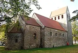 Die romanische Kirche entstand im 12. Jahrhundert als vollständige Anlage aus Bruchsteinen. Das Kirchenschiff wird nach Osten durch einen eingezogenen Chor und eine halbkreisförmige Apsis abgeschlossen. An der Westseite des Schiffs befindet sich der auf querrechteckigem Grundriss Ende des 12. Jahrhunderts/Anfang des 13. Jahrhunderts errichtete Kirchturm. Der Turm ist dabei etwas breiter als das Kirchenschiff. Er wird von einem Satteldach bedeckt. Heute im Glockengeschoss vorhandene Öffnungen wurden erst später eingefügt. Die Mauerstärke des Turms beträgt 1,70 Meter, die des Schiffs 1,00 Meter.