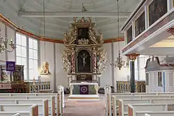 Valentin Preuß schuf 1688 den barocken Altar, über dessen Tisch sich eine Darstellung des letzten Abendmahls aus dem Jahre 1843 angebracht ist. Der Hauptteil zeigt zwischen zwei gedrehten Säulen eine Darstellung der Kreuzigung, die von den Evangelisten Matthäus und Markus flankiert und von einem Wappen des Stifters (Senator John) überdacht wird. Im oberen Teil befindet sich ein Bild der Erscheinung des Auferstandenen aus dem 20. Jahrhundert sowie die Statuen der Evangelisten Lukas und Johannes. Die Altarschranken mit ihrem reichen Schmuck aus geschnitzten Akanthusornamenten und Engelsköpfen wurden 1843 ergänzt.