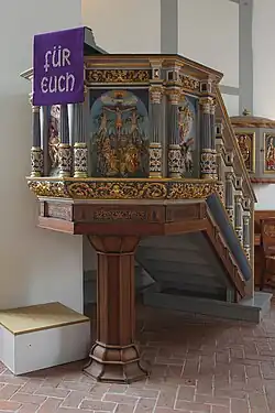 Die sechzehn Emporenbilder des Malers Martin Conrad aus dem Jahr 1720 zeigen eine Vielzahl biblischer Szenen wie Einzug in Jerusalem, Abendmahl, Gethsemane, Judasverrat, Christus vor Kaiphas, Petri Verleugnung, Himmelfahrt und die Ausgießung des Heiligen Geistes. 1846 wurden die Bilder stark überarbeitet.