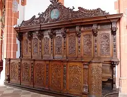 Das Grabmal des Rektors Johannes von Neuerburg († 1576) wurde 1569 zu seinen Lebzeiten gesetzt und wahrscheinlich von Hans Bildhauer in Trier geschaffen, von dem das Segensisgrabmal in der Trierer Liebfrauenkirche stammt. Das Reliefbildnis als Halbfigur mit ausdrucksvoller Physiognomie und reich gefälteltem Gewand ist in einer rahmenden Pilaster-Ädikula präsentiert. Das Grabmal des Rektors Nikolaus Deunsch († 1618) wurde von einem Nachfolger Hans Ruprecht Hoffmanns geschaffen und zeigt den Verstorbenen in reicher Rahmenarchitektur.[1]