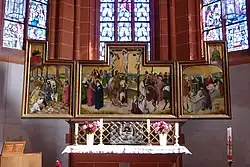 Hauptstück der bemerkenswert reichen Ausstattung ist ein großes gemaltes Flügelretabel, ein Frühwerk des Meisters des Marienlebens aus Köln aus der Zeit um 1450/1460. Dargestellt ist in der Mitte eine figurenreiche Kreuzigung mit dem Bildnis des Kardinals als Stifter und seines Diakons. Innen auf den Flügeln ist die Verspottung und Grablegung Christi zu sehen, auf den Außenseiten Heilige in Dreiergruppen. Zwei Seitenaltäre aus den Jahren 1731 und 1733 zeigen Figuren des Salvator mundi und der Muttergottes. An der Nordwand des Langhauses ist ein großes Wandgemälde des Jüngsten Gerichts aus der zweiten Hälfte des 15. Jahrhunderts erhalten. Drei Tafeln von einem gemalten Altaraufsatz nach der Mitte des 15. Jahrhunderts zeigen die Muttergottes, die Verkündigung und eine Gruppe von vier Heiligen.