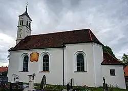 Die im Kern ältere Saalkirche wurde 1758 durchgreifend erneuert. Sie besteht aus einem Langhaus, einem eingezogenen, dreiseitig geschlossenen Chor im Osten, einer Sakristei an der Stirnseite des Chors und einem Kirchturm, der im Westen halb in die Fassade eingestellt ist. Sein oberstes Geschoss enthält hinter den als Biforien gestalteten Klangarkaden den Glockenstuhl.