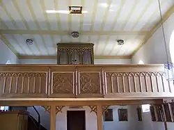 Auf der geräumigen Empore steht in der Breite des einspringenden Turmes die einmanualige Orgel mit dreigeteiltem Prospekt in historischer Rahmenbauweise mit drei Manual-Registern und Pedal. Vor dem Orgelgehäuse steht der freistehende Spieltisch. Die Orgel stammt vom Regensburger Orgelbauer August Hartmann.[5] Sie ersetzt die Vorgängerorgel aus dem Jahr 1905 von Ludwig Edenhofer.