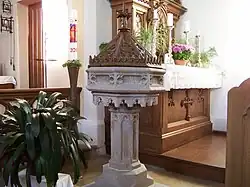 Beim rechten Seitenaltar steht das aus hellem Sandstein gefertigte Taufbecken. Vom quadratischen Sockel geht der profilierte Schaft in ein Achteck über, auf den die mit Ornamenten verzierte achteckige Schale folgt. Die Abdeckung besteht aus einer achteckigen Pyramide aus Holz mit geschnitzten gotischen Ornamenten und einer Kreuzblume.