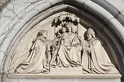 Betreten wird die Kirche durch das spitzbogige Westportal. Das Steinrelief im Tympanon zeigt Maria als Rosenkranzkönigin mit den heiligen Dominikus von Caleruega und Papst Pius V. Es wurde um 1890 von dem steirischen Bildhauer Rochus Haas gefertigt. Die ehemalige Holztür mit der gemalten Darstellung des Heiligen Nikolaus aus dem 13. Jahrhundert ist seit 1937 im Besitz des Joanneums in Graz.