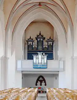 Der geschnitzte Hochaltar entstand um 1490. In seinem Schrein befindet sich eine Kalvarienbergdarstellung; die Flügel zeigen mehrere Heilige.[12][13]