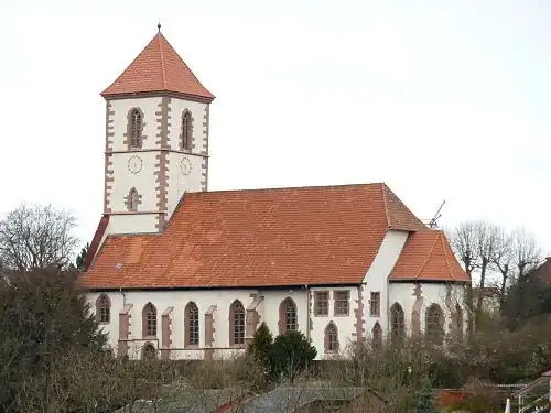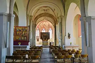 Die Kirche wurde ab dem 14. Jahrhundert in mehreren Phasen in gotischen Formen umgebaut, wobei der romanische Chorabschluss einem gotischen Chorpolygon mit Fünfachtelschluss weichen musste. Das gotische Langhaus entstand im späten 15. Jahrhundert, wie ein überliefertes Testament zugunsten des Baus bezeugt.[5] Anstelle der romanischen Basilika entstand eine dreischiffige, dreijöchige Staffelhalle mit Kreuzrippengewölbe. Der Schlussstein des westlichen Mittelschiffjochs trägt die Jahreszahl MCCCCCI (1501) und datiert den Abschluss der Arbeiten.