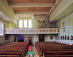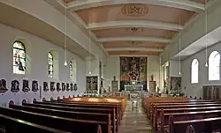 Zur Ausstattung der Kirche gehört ein Kreuzweg bestehend aus Reliefs, der vom Altar aus gesehen an der rechten Seite des Innenraums angebracht ist. Im Altarraum befinden sich zahlreiche Heiligenfiguren. Flankiert wird der Altarraum von zwei Seitenaltären, über denen Gemälde angebracht sind. Auf einer Empore über dem Eingang ist die 1989 erbaute Orgel der Firma Hugo Mayer Orgelbau aufgestellt. Das Instrument besitzt 6 Register auf einem Manual und Pedal.