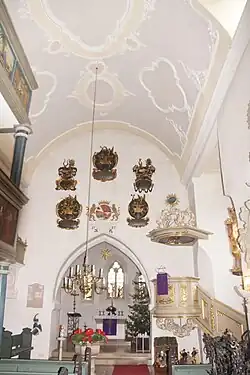 Der Innenraum des Langhauses ist mit einem Tonnengewölbe, das mit Stuck verziert ist, überspannt, der des Querschiffes mit einer Flachdecke und der des Chors mit einem Kreuzgratgewölbe. Das Langhaus hat doppelstöckige Emporen an zwei Seiten, deren Brüstungen mit biblischen Szenen bemalt sind. Die Glasmalereien stammen von Veit Hirschvogel. Die Orgel mit 14 Registern, zwei Manualen und Pedal wurde 1898 von Johannes Strebel gebaut.