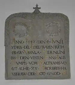 - Das Epitaph für Ursula Habitzel ist an der südwestlichen Ecke des linken Seitenschiffes erhalten. Sie starb 1558 und war wohl die Mutter der Äbte von Kloster Weißenau und der Abtei Weingarten.[7]