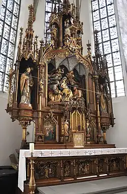 - Der Hochaltar wurde in der Zeit um 1870 aufgestellt.[3] Der den Kirchenraum beherrschende Altar ist eine Arbeit des Karl Reihing aus Tettnang. Nikolaus Geiger aus München schuf 1871 die zentrale Figurengruppe mit der Darstellung der Geburt Jesu.[6]