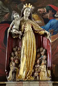 Die Schutzmantelmadonna, eine der bekanntesten ihrer Art, schnitzte Johann Rueland 1474, sie steht im Zentrum der Kapelle. Maria wird im Typus einer Frau, die schützt und hegt, dargestellt. Unter dem weit geöffneten Umhang suchen viele Personen, die relativ klein dargestellt sind, Schutz. Das Jesuskind sitzt auf dem rechten Unterarm der Maria.[9] Sie wirkt in ihrer körperlichen Schönheit zart und gleichzeitig würdevoll. Die Hände sind fein ausgearbeitet, der Mund in dem schönen Gesicht lächelt.[10]