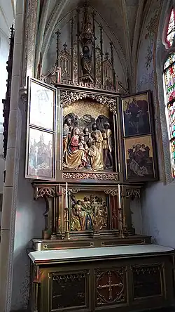 Der Hochaltar von 1896 ist das künstlerisch wertvollste Werk der Regotisierung und fügt sich mit den Glasmalereien der Mayer’schen Hofkunstanstalt in München aus den Jahren 1897–1910 in die Gesamtwirkung des gotischen Chors ein. Drei weitere Altäre sind in den Jahren 1882/83 entstanden. Die geschnitzten, steinfarbigen Apostelstatuen im Chor wurden 1896 von Karl Georg Huber aus München geschaffen.