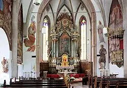 Der barocke Hochaltar wurde von Hannibal Bittner aus Kärnten bezogen. Das Hochaltarblatt, welches den Hauptpatron Nikolaus von Myra, den Nebenpatron Gallus, sowie darüber auf Wolken thronend Muttergottes mit Kind darstellt, schuf 1750 der italienische Maler Marco Antonio Vincenzi auf Bezahlung des damaligen Kirchenprobstes.[8] 1986 legte man am Gewölbe des rechten Seitenschiffes hochgotische Fresken der Evangelisten frei. 1938 bemalte der Künstler Konrad Fasal aus Brixen die Wandflächen mit dem Kreuzweg Christi.[9] Die Orgel fertigte 1893 der Orgelbauer Franz Reinisch aus Steinach.[10] Die Kirche ist von einem alten Friedhof mit steinernen Umfassungsmauer umgeben.