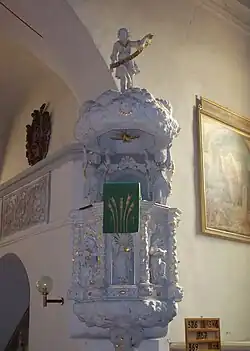Die sechseckige, aus Sandstein gefertigte Taufe stammt aus dem Jahr 1896 und wurde dem hölzernen Original der von Kretzschmar 1652 errichteten Taufe nachempfunden. Im Original erhalten ist eine Sandsteinkanzel, deren Entwurf ebenfalls von Kretzschmar stammt und auch über ein Signum von ihm verfügt. An der heutigen Stelle befindet sich die Kanzel jedoch erst seit dem Umbau der Kirche im Jahr 1720. Der Korb der Kanzel ist mit gedrehten Säulen sowie mit Skulpturen von Christus und den Evangelisten versehen. Der von zwei Engeln getragene Schalldeckel ist mit einer Wolkendecke verziert. Über ihm ist ein Engel mit einem Spruchband zu sehen.