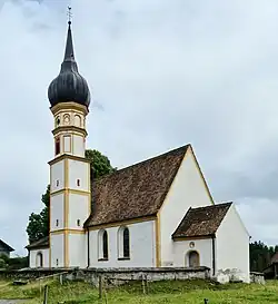 Die 1721/23 barock umgestaltete spätgotische Saalkirche besteht aus dem Langhaus, dem eingezogenen, dreiseitig geschlossenen Chor im Osten, dem im Kern spätgotischen Chorflankenturm auf quadratischem Grundriss an der Nordwand des Chors, der Sakristei an der Nordostecke von Chorflankenturm und Chor und einem Vorbau im Westen des Langhauses, in dem sich das Portal befindet. Der Turm wurde 1698 mit zwei achteckigen Geschossen aufgestockt und mit einer Zwiebelhaube bedeckt.