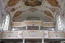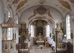 Die Deckenfresken im Chor und im östlichen Teil des Langhauses wurden von Johann Georg Bergmüller ausgeführt, der von 1730 bis zu seinem Tod im Jahr 1762 Direktor der Augsburger Kunstakademie war.