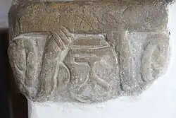 - Beim Weihwasserbecken am Nordportal handelt es sich um ein Würfelkapitell aus dem 13. Jahrhundert. Auf der Vorderseite ist eine Tartsche mit einem Steinmetzzeichen aus dem 16. Jahrhundert dargestellt.