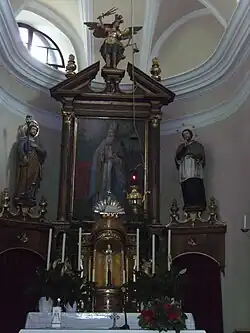 Das Kirchenschiff besteht aus einem zweijochigen Langhaus mit Pilastergliederung und stark verkröpftem Gebälk, in das auch die Rundapsis einbezogen ist. Im Jahre 1895 wurde auf den Turm das heutige Dach aufgesetzt.