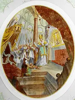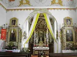 14 Deckenfresken von Vitus Greitman (auch: Greittmann/Greithmann) stellen Szenen aus dem Leben des Kirchenpatrons dar, das Hauptfresko im Langhaus, auf Treppenstufe signiert und datiert, 1753. Mehrere Sinnsprüche enthalten jeweils ein Chronogramm, das in der Summe der römischen Zahlzeichen das Jahr 1753 ergeben. Die Stuckierung in Malerei ist vorgetäuscht. Die geschnitzten Stuhlwangen aus dem frühen Rokoko wurden um 1740 geschaffen.[5]