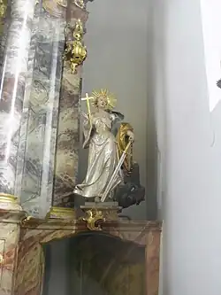 Den barocken Hochaltar mit Altarblatt des Kirchenpatrons flankieren Statuen des hl. Willibald und der hl. Walburga, im Auszug stellt eine Schnitzgruppe die Krönung Mariens dar. Über den seitlichen Durchgängen befinden sich links die Statue des hl. Johannes Baptist und rechts die der hl. Margareta von Antiochia, frühe Werke von Philipp Jakob Rämpl (* 1728; † 1809) aus Wolfratshausen, 1761 geschnitzt.