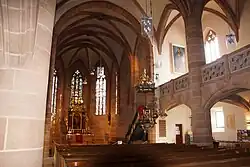 Der barocke Altar ist mit zwei Säulen und einem gesprengten Giebel aufgebaut. Das Altarretabel von 1702 zeigt ein Ölgemälde eines unbekannten Malers mit Christus am Kreuz. Ein kleines gotisches Sakramentshaus stammt aus dem späten 15. Jahrhundert. Die bildliche Allegorie über die Konfession von 1602 stammt von Andreas Herneisen.