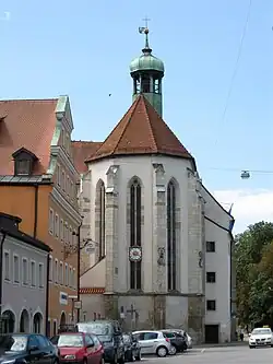 Die Stifter des Frauenstiftes, Friedrich Auer und Karl Prager hatten bereits 1307 eine Stiftung für 12 Pfründnerinnen gegründet. Sie sollten in Gebäuden mit Anschluss an die unmittelbar benachbarte Kirche Unterkunft und Betreuung durch die Karmeliten finden. Die benötigten Wohngebäude schlossen sich im Westen direkt an die Kirche an, was heute die Aufklärung der baulichen Verhältnisse für das Gebäude der Kirche erschwert, zumal das Langhaus der Kirche nach 1604 auch noch erweitert wurde. Außerdem verlief in der westlich angrenzenden Straße Weißgerbergraben bis 1320 die Arnulfinische Stadtmauer und in der nördlich angrenzenden Donau-Uferstraße (Keplerstraße / Holzlände) die mittelalterliche Stadtmauer. Steine der Stadtmauern haben sich bei den seit 2019 laufenden Sanierungsarbeiten auch in den Mauern der südlich an die Kirche anschließenden Wohngebäuden gefunden, so dass die Spitalwohngebäude auch direkt mit der Stadtmauer verbunden gewesen sein könnten. Der Zugang zur Kirche erfolgte früher im Osten. Der heutige Eingang mit Vorhalle im Westen wurde erst 1908 errichtet und könnte die baulichen Überlieferungen erneut verändert haben.[1] [Anm. 1]
