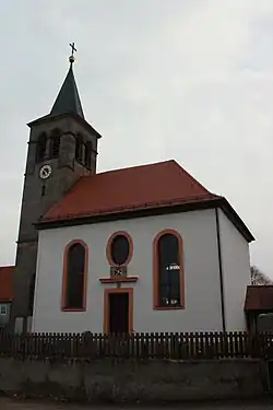Der Vorgängerbau der heutigen, am 19. Juni 1735 eingeweihten Saalkirche wurde im Dreißigjährigen Krieg zerstört. Das neue Langhaus hatte zunächst nur einen Dachreiter, der quadratische Chorturm aus Quadermauerwerk im Osten wurde erst 1870 gebaut. Sein oberstes Geschoss beherbergt hinter den als Biforien gestalteten Klangarkaden den Glockenstuhl, in dem seit 1950 wieder drei Kirchenglocken hängen. Darunter befindet sich die Turmuhr. Der achtseitige, schiefergedeckte Knickhelm wurde ihm erst 1978 aufgesetzt. An der Außenwand des Chorturms ist ein Kriegerdenkmal angebracht.[1] Die Orgel mit 13 Registern, 2 Manualen und Pedal wurde 1991 von Hey Orgelbau errichtet.[2]