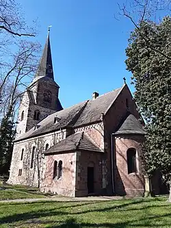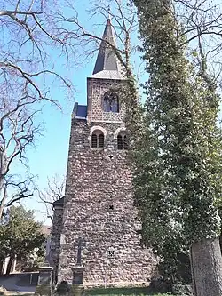 Von der um das Jahr 1200 errichteten romanischen Bruchsteinkirche ist lediglich der untere Teil des Westquerturms mit seinen romanischen Plattenfenstern erhalten. Zwischen Turmraum und Kirchsaal findet man zwei, eine Doppelarkade tragende romanische Kantensäulen, sowie eine Mittelsäule, die mit Ecksäulchen und Blattkapitellen verziert ist.