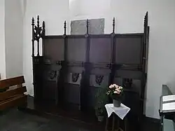 - Das geschnitzte, neugotische Hauptaltarretabel wurde 1903 angefertigt. In ihm befinden sich sieben Steinreliefs, vom Ende des 16. Jahrhunderts, mit Szenen aus der Passion Christi.
