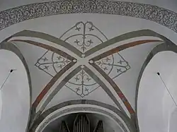 Im Mittelschiff und in den ehemaligen Querarmen ruhen Kreuzgratgewölbe auf breiten Kreuzpfeilern, die Querarme sind vom Mittelschiff durch niedrige Scheidbögen abgesetzt. In das Ostjoch, die Apsis, die Seitenschiffe und den Turm wurden Spitzbögen und scharfgratige, gebuste Gewölbe eingezogen.
