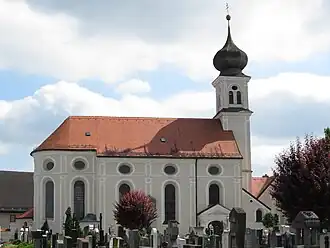 Die barocke Saalkirche wurde 1699 nach einem Entwurf von Hans Kogler erbaut. Sie besteht aus dem Langhaus, dem eingezogenen, halbrund geschlossenen Chor im Osten, der nach Südosten an den Chor angebauten Sakristei, dem halb in das Langhaus im Westen eingestellten Kirchturm und einem Vorbau an der Südwand des Langhauses, in dem sich das Portal befindet. Das oberste Geschoss des Kirchturms enthält hinter den als Biforien gestalteten Klangarkaden den Glockenstuhl mit zwei Glocken. Darauf sitzt eine Zwiebelhaube.