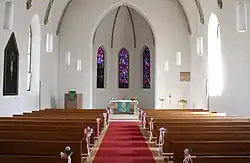 Die Kirche ist ein rechteckiger neugotischer Saalbau mit Giebelreiter über der Eingangsfront und einem Chorraum, dessen Apsis aus fünf Teilen eines Oktogons besteht. Die Kirche ist in ihrer äußeren Form sehr schlicht, die Seitenwände und die Apsis besitzen jeweils drei gotische Fenster.